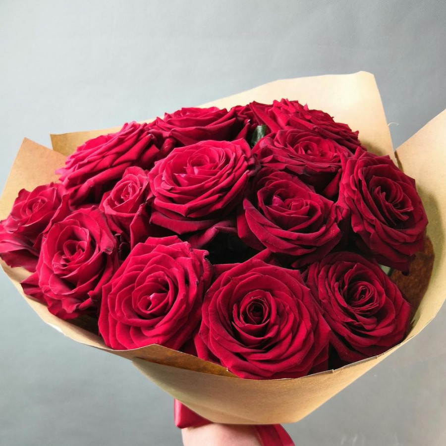 На фото букет из 13 бордовых роз. В составе: роза 13 шт, крафт-бумага 1 шт, атласная лента 1 шт, . Все цветы свежие и ароматные, букет красиво оформлен и отлично подходит для подарка. Доступна доставка цветов или самовывоз.