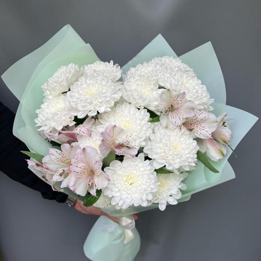 На фото букет «белая акварель». В составе: альстромерия 2 шт, хризантема кустовая 3 шт, дизайнерская упаковка 1 шт, атласная лента 1 шт, . Все цветы свежие и ароматные, букет красиво оформлен и отлично подходит для подарка. Доступна доставка цветов или самовывоз.